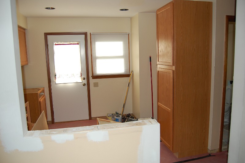 The cabinet on the right of the below picture is a floor to ceiling pantry. The refrigerator will be on the left side of the pantry.