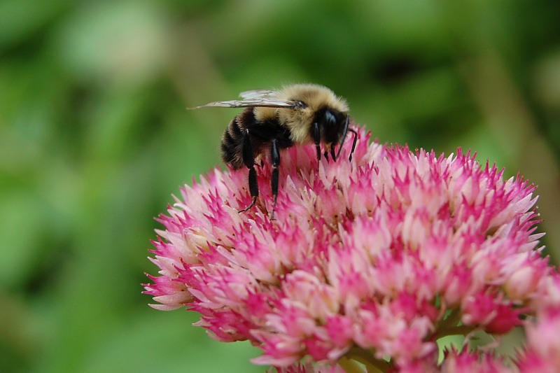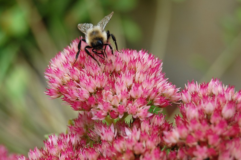 While I was shooting my stonecrop plant the other day, I wasn’t the only one interested in it. There were also a couple of bees collecting the last nectar of the season.
