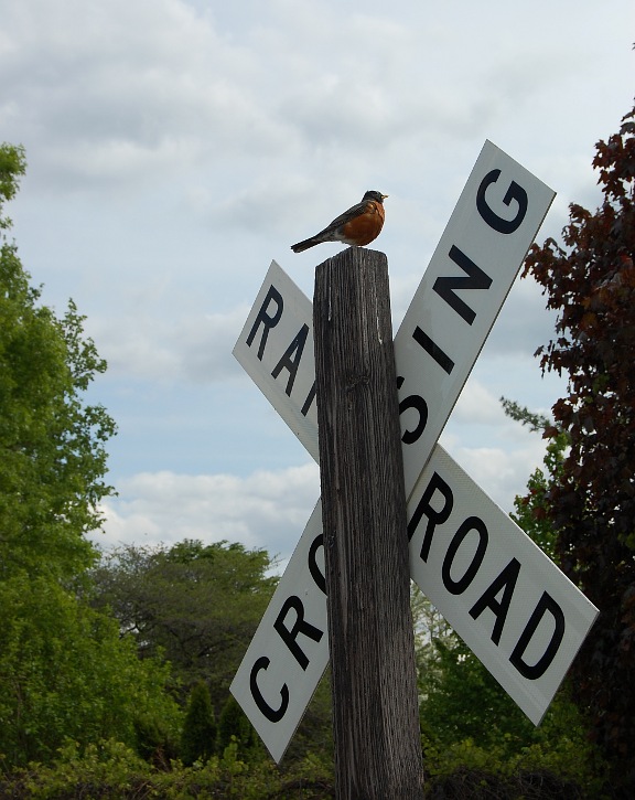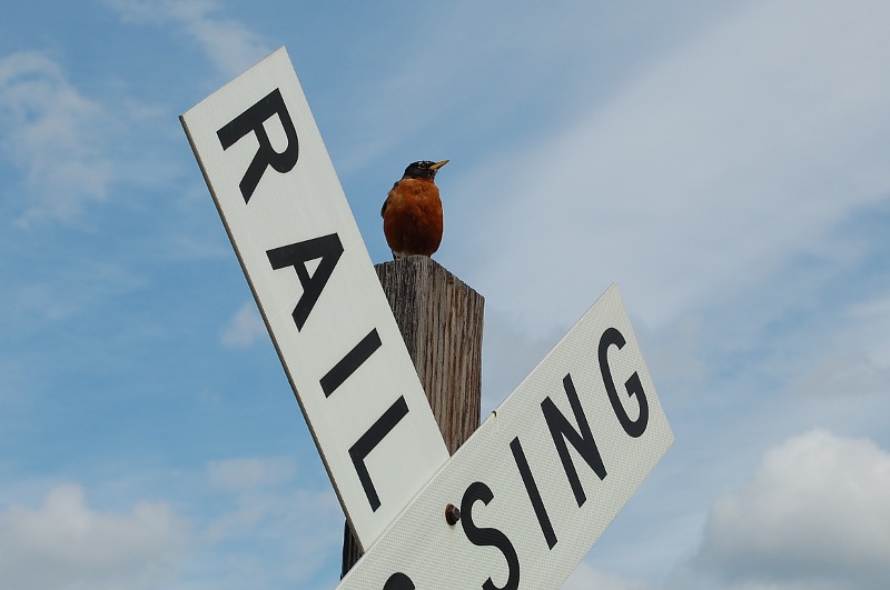 Robin crossing May 12, 2010BirdsJonathan While walking the neighborhood the other day, I came across this robin, perched regally on the top of the railroad crossing sign. The robin was very tame, and let me get within 3-4 feet to take her portrait.