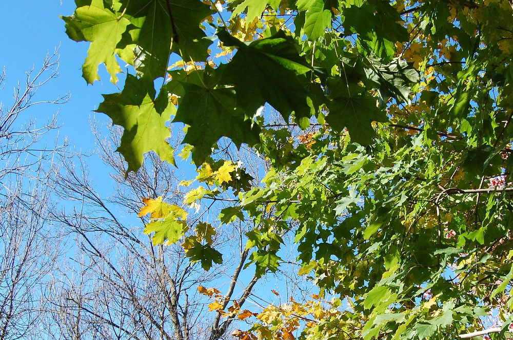 Despite the fact that the majority of trees in my neighborhood have turned colors and lost their leaves, the maple in my backyard is still hanging on to most of its green color.