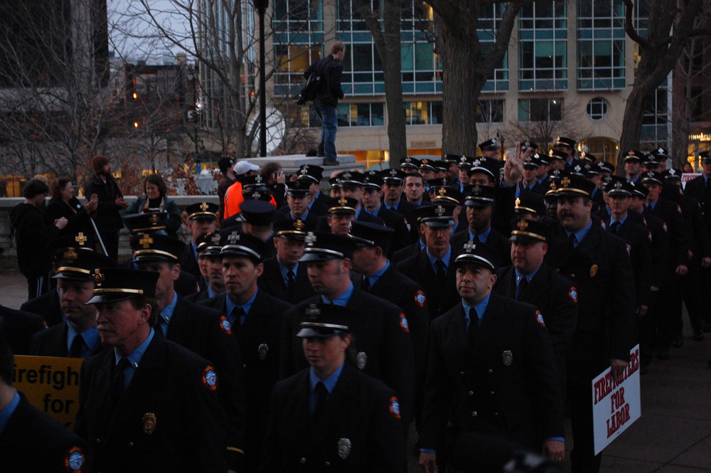 During the rally, we started to hear bagpipes. It was an army a firefighters, marching in to add their support.