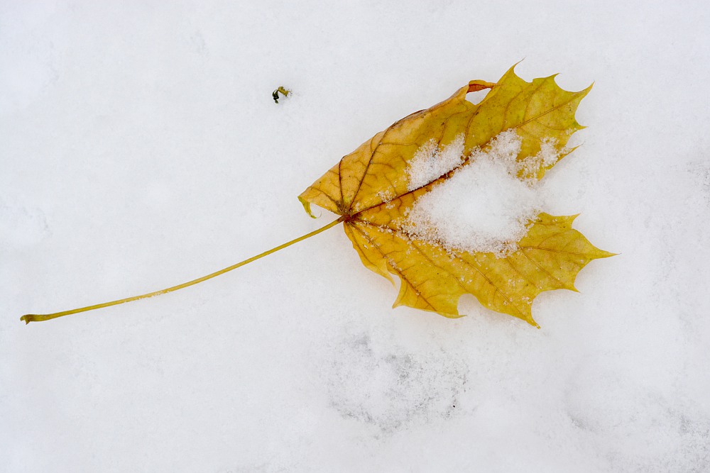The red leaf looks like it is struggling to hold up the snow – but with sheer strength it does – just like in life – sometimes by sheer strength or will power, beauty happens.