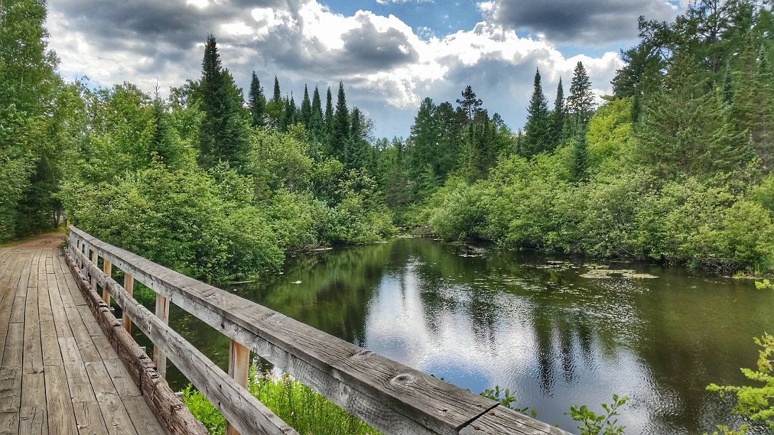 Suddenly you’re a passenger on the Northwoods Hiawatha, watching the scenery go by. There are over a dozen historical signs along the 18 mile trail. They tell stories of logging towns that no longer exist, early area settlers, railroad stations that served summer tourists, and various landmarks. The most interesting one is the sign along the Harshaw Trestle. It details an incident when a steam locomotive derailed and fell into the marsh, along with three rail cars. The railroad repaired the rails and brought in two cranes in an attempt to retrieve the expensive locomotive. One of the cranes tipped over during this effort, also falling into the marsh. The recovery operation was abandon after several days, as the locomotive, three cars, and crane, slowly sank further and further down. The locomotive and other equipment remains in the marsh to this day, covered by a natural shroud of water and moss.