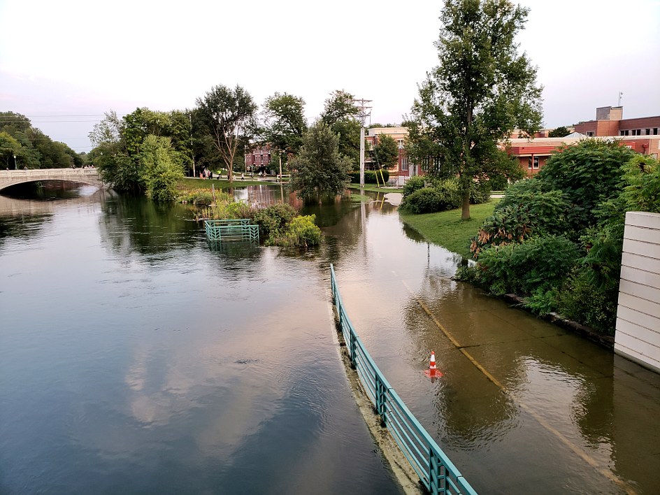 I biked the Yahara River trail to check out the flooding tonight. The bicyclist above is riding down the middle of Johnson Street in front of the Tenney Park Lagoon.