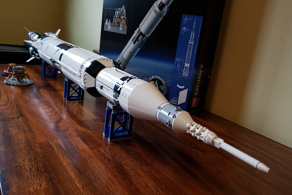 After bag twelve, the mighty Saturn V is complete! It stands 100cm tall. For some scale, see the Lego astronaut standing in front of the main engines.