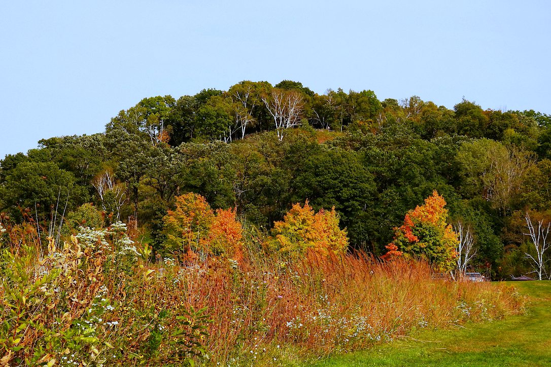 Hillside of mostly green trees, with autumn colors starting to appear