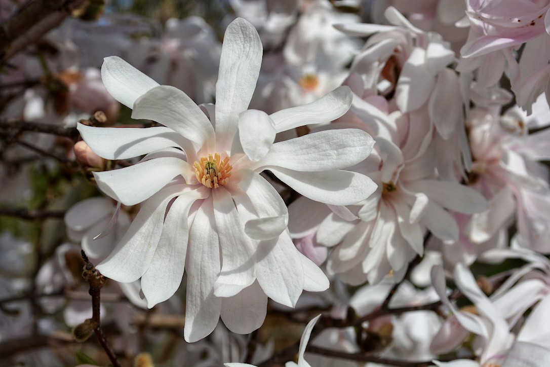 White magnolia blossom with yellow stamens in front of other blossoms which are out of focus
