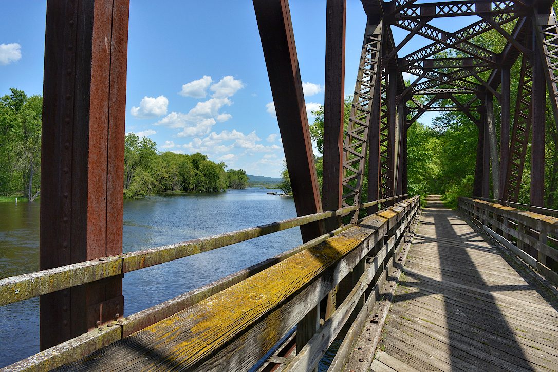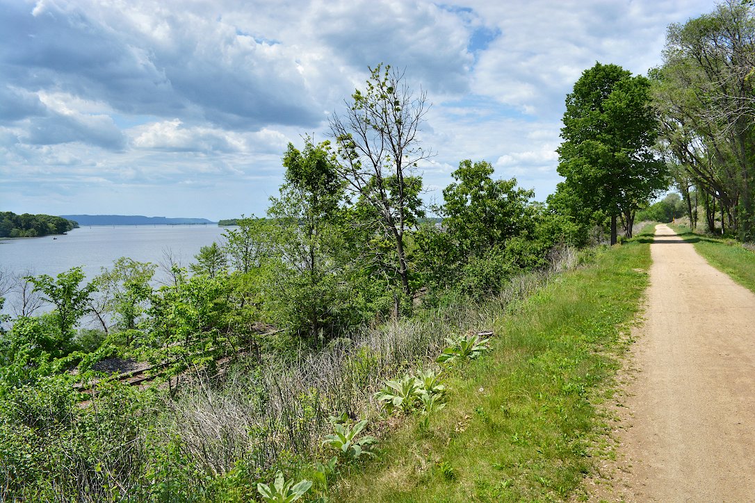 Like most trails that were build on abandoned railbeds, the Great River State Trail does have long, straight (almost monotonous) stretches that go along farms, prairies, and through dense woods. But this trail does have a few more scenic views than the average former-railroad trail in Wisconsin, like the above bridge, and spots that overlook the Mississippi River.