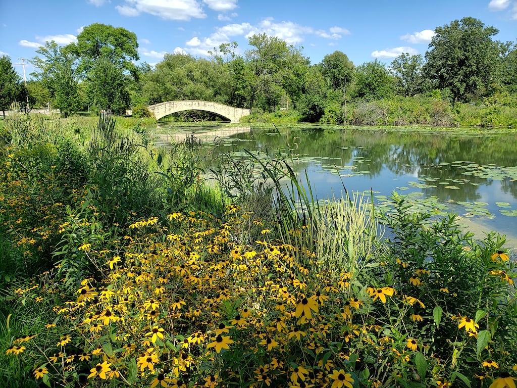 Lagoon with a small stone bridge and trees in the background. Yellow wildflowers and tall grass in the foreground.