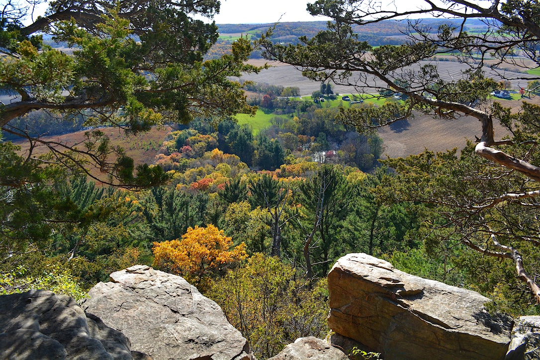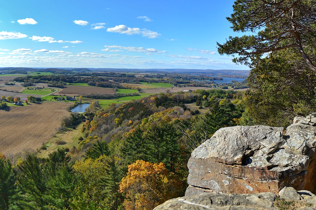 A view from the top of a rocky bluff.  Below the bluff are farm fields, trees, and a river in the distance.