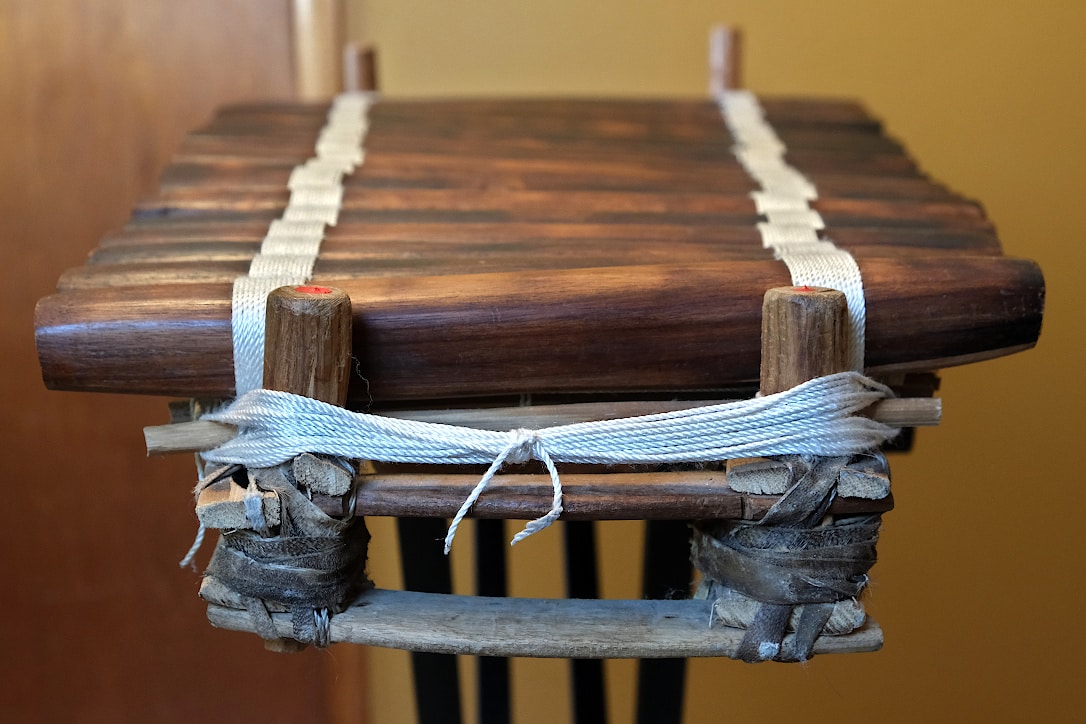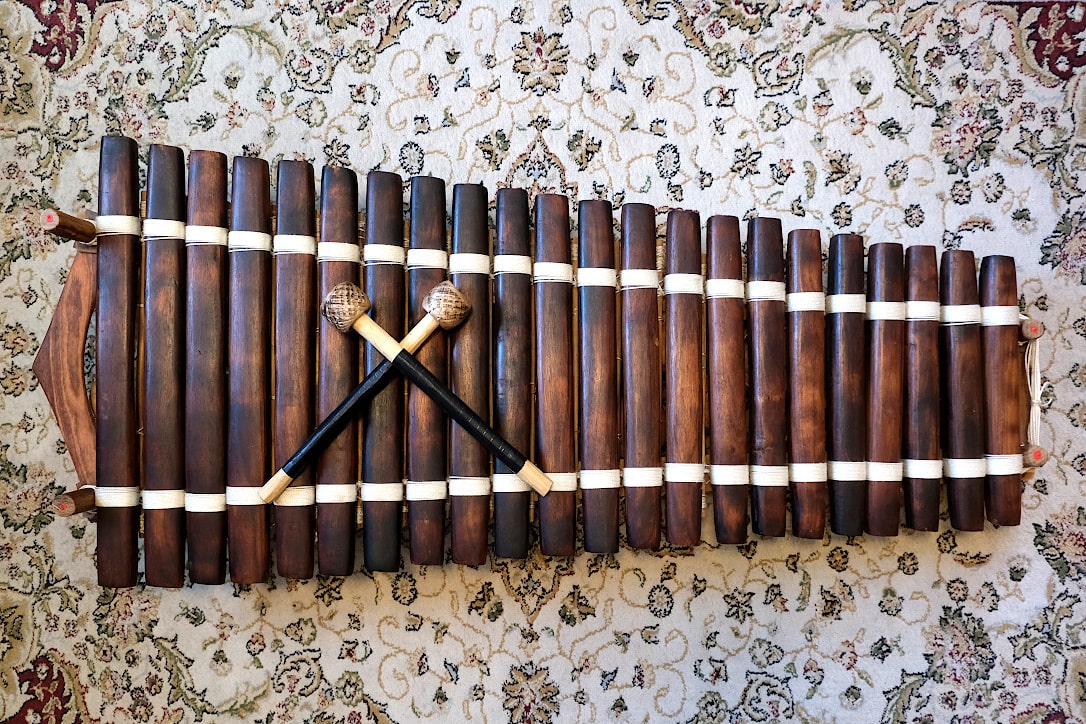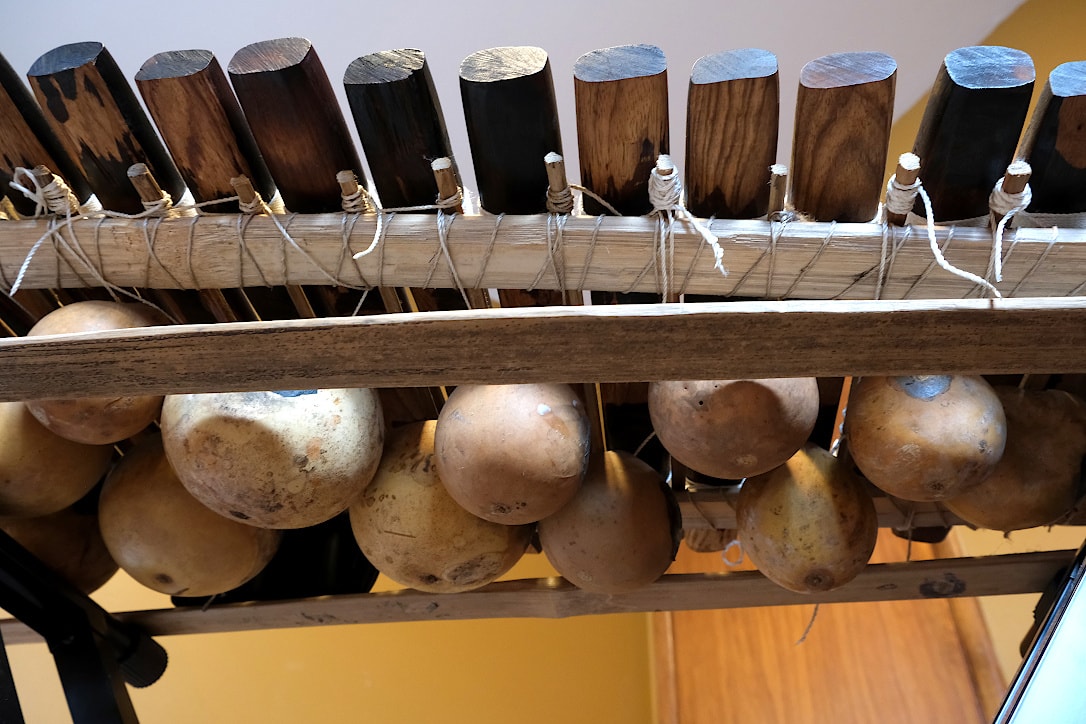 This balafon is made with Haré (Khadi) wood by West African craftsmen, and uses hollow gourds for resonators. It’s tuned to a major scale (3 octaves) but without western music’s black keys. Originally sold from Wula Drum, I bought it used.